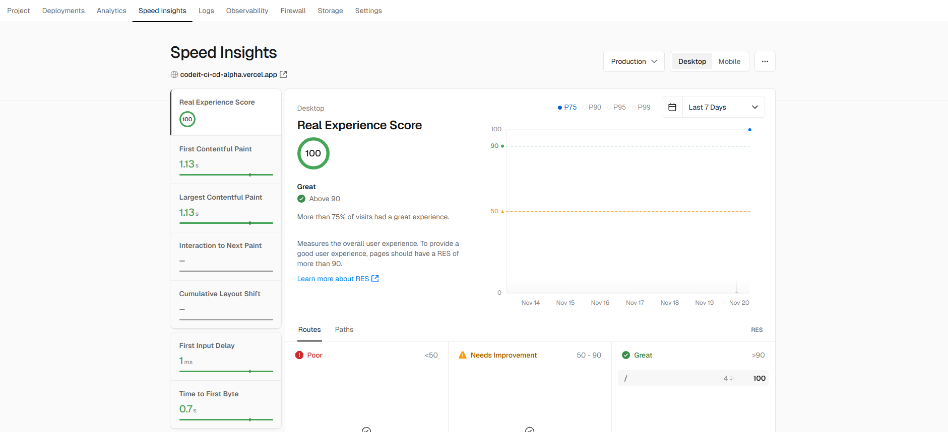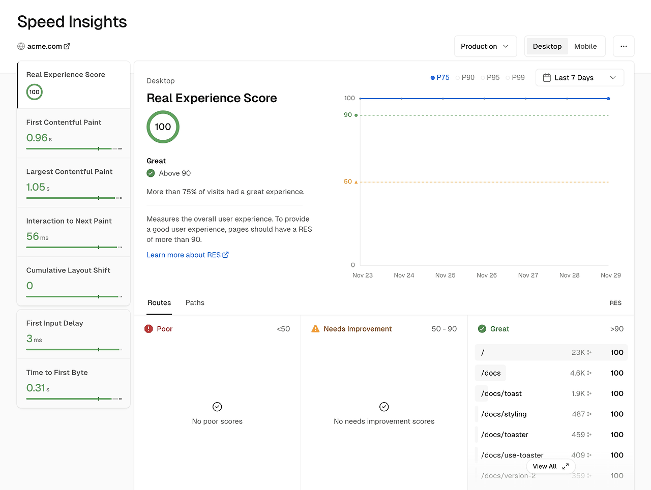 Vercel Speed Insights provides you with a detailed view of your website's performance metrics, based on Core Web Vitals, enabling you to make data-driven decisions for optimizing your site. For granular visitor data, use Web Analytics.