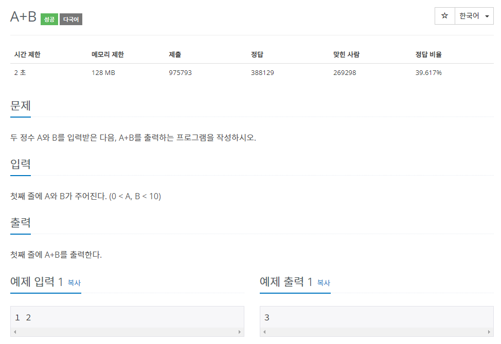 두 개의 정수값을 공백으로 구분하여 입력받아 그 합을 출력해야하는 문제입니다.